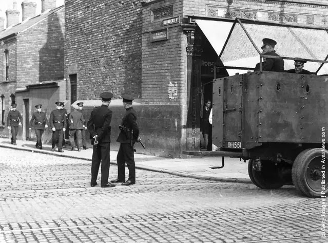 Brit Északír Rendőrség (RUC) járőrözik az Orange Day felvonulás után kitört zavargások idején a belfasti York Street-en (Fotó: Fox Photos/Getty Images). 1935. június 22. |