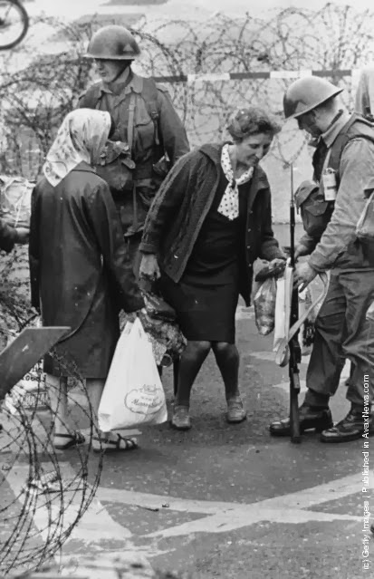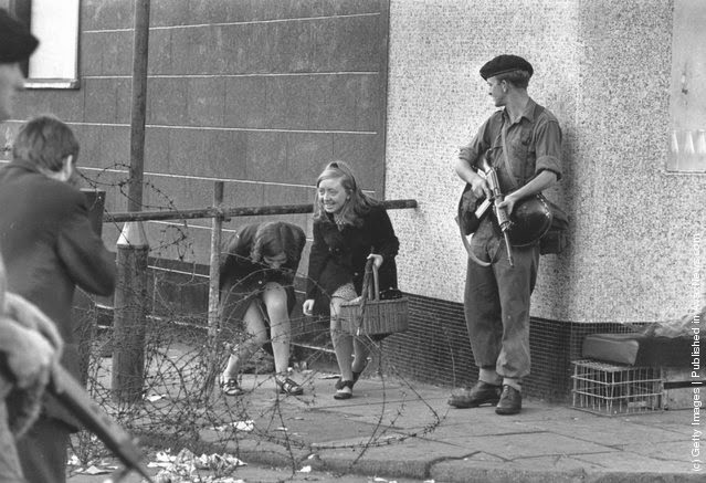 | A Falls Road-i összecsapások után brit katona állít meg egy gyermekével a szögesdrót akadályon átkelni szándékozó férfit. Belfast. (Fotó: James Jackson/Getty Images). 1969. augusztus |
