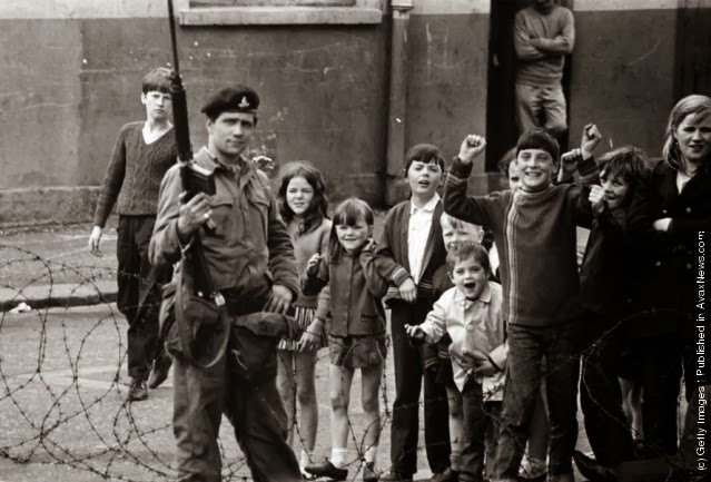 | Gyerekek mulatságosnak találják, hogy brit katonák motozzák meg őket. (Fotó: Keystone/Getty Images). 1971. december 7. |