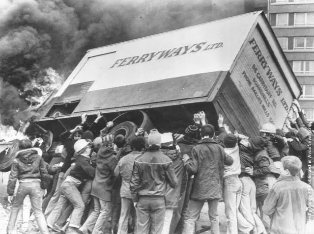 | Falls Road-i asszonyok élő lánccal tiltakoznak a napok óta tartó erőszak ellen. (Fotó: Malcolm Stroud/Express/Getty Images). 1970. július 3. |