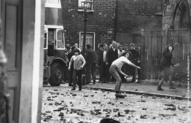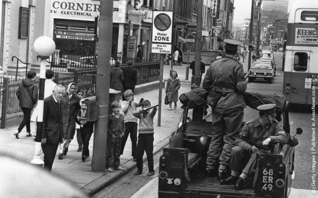.jpeg) Gyerekek cukkolják a brit katonai járőrt. Belfast. (Fotó: Malcolm Stroud/Express/Getty Images). 1970. július