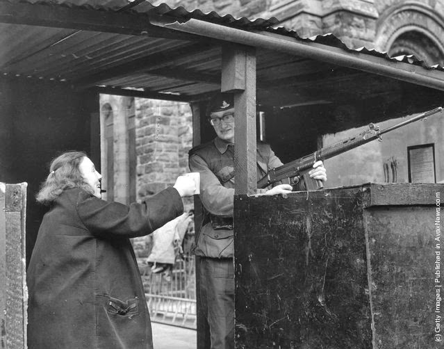 | Belfasti nő teával kínálja a brit katonai posztot. (Fotó: Chris Ware/Keystone Features/Getty Images). 1971. április 20. |