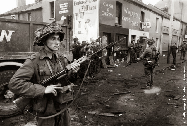 | Brit katonák járőröznek az egyik IRA által meghirdetett tűzszünet idején a Lisbon Street-en. (Fotó: Evening Standard/Getty Images). 1972. |
