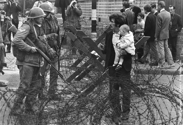 | A Falls Road-i összecsapások után brit katona állít meg egy gyermekével a szögesdrót akadályon átkelni szándékozó férfit. Belfast. (Fotó: James Jackson/Getty Images). 1969. augusztus |
