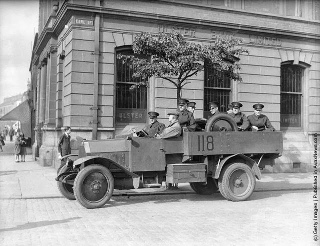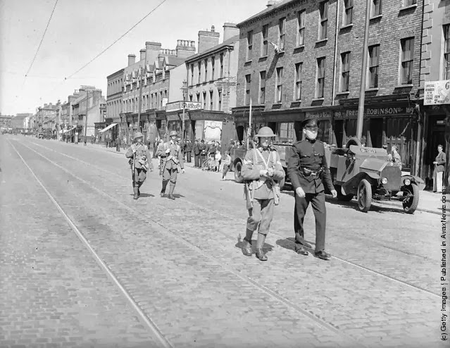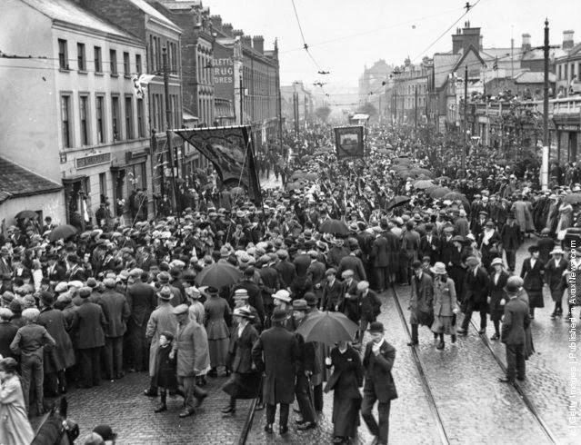 Eközben a parlamentben éles és végeláthatatlan viták folytak Írország függetlenségéről – mivel a protestánsok ki akartak maradni minden, az íreket érintő rendeletből, továbbra is angol kormányt akartak. 1913-ban létrejött az Ulsteri Önkéntes Erők (Ulster Volunteer Force), egy rendkívül agresszív katolikusellenes félkatonai szervezet, amely ellen a rendőrség nem tette meg a megfelelő lépéseket, így a katolikusok is megalakították a maguk félkatonai szervezetét, az Ír Önkéntes Erők-et (Irish Volunteer Force). A képen jobbra dublini Sinn Féin tagok.