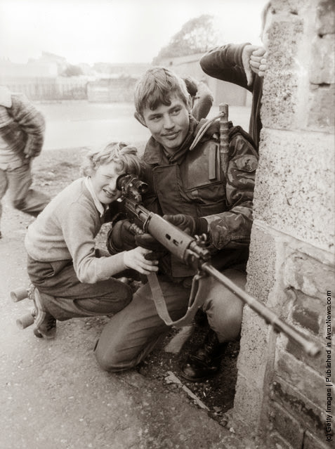 | Brit katona engedi egy kisgyereknek, hogy belenézzen a fegyver távcsövébe. (Fotó: Central Press/Getty Images). 1981. május 13. |