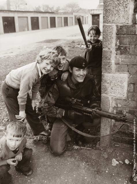 | Gyerekek mulatságosnak találják, hogy brit katonák motozzák meg őket. (Fotó: Keystone/Getty Images). 1971. december 7. |