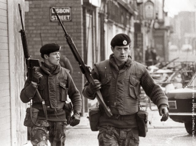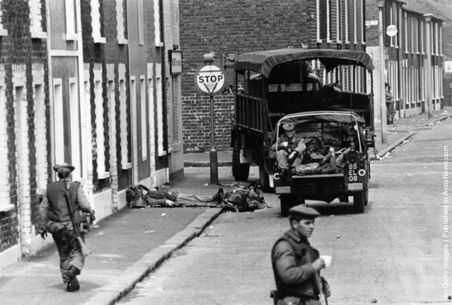 | Brit katonák járőröznek az egyik IRA által meghirdetett tűzszünet idején a Lisbon Street-en. (Fotó: Evening Standard/Getty Images). 1972. |