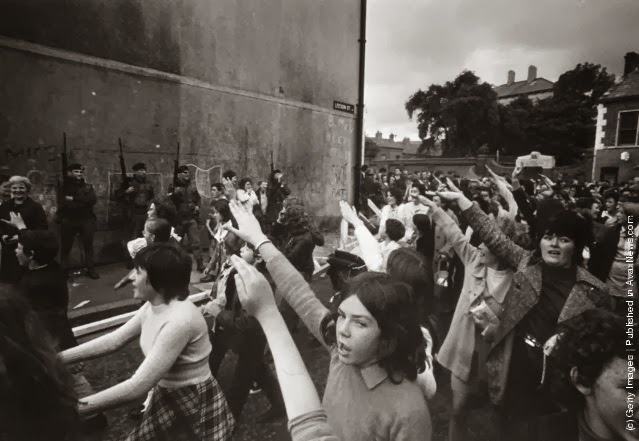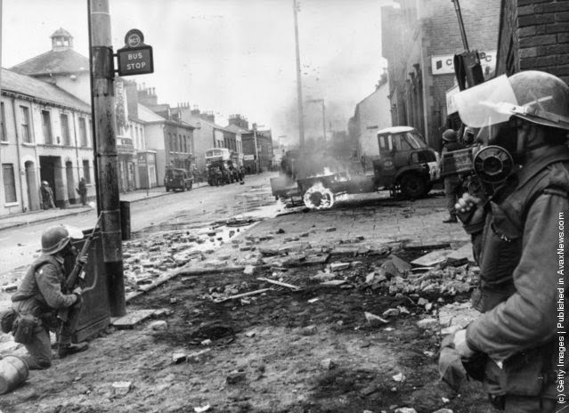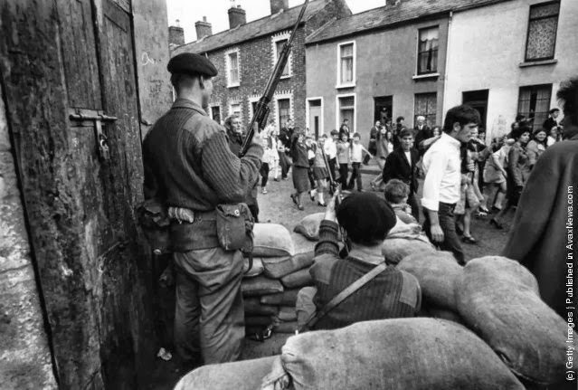| Brit katonák védekező állásban a Falls Road-on. (Fotó: Wesley/Keystone/Getty Images). 1970. július 4. |