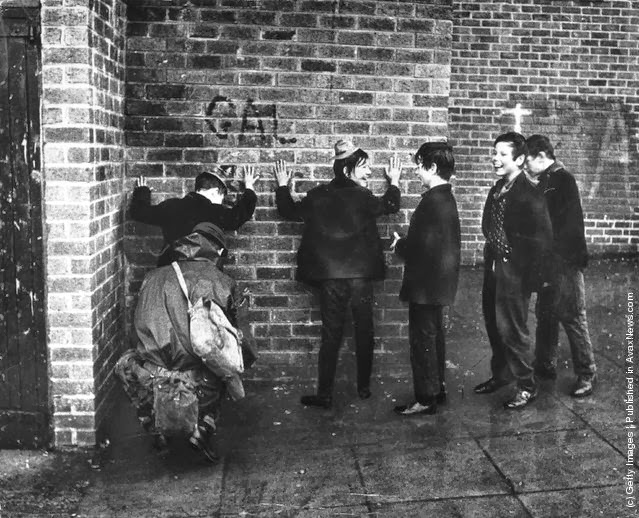 | Gyerekek mulatságosnak találják, hogy brit katonák motozzák meg őket. (Fotó: Keystone/Getty Images). 1971. december 7. |